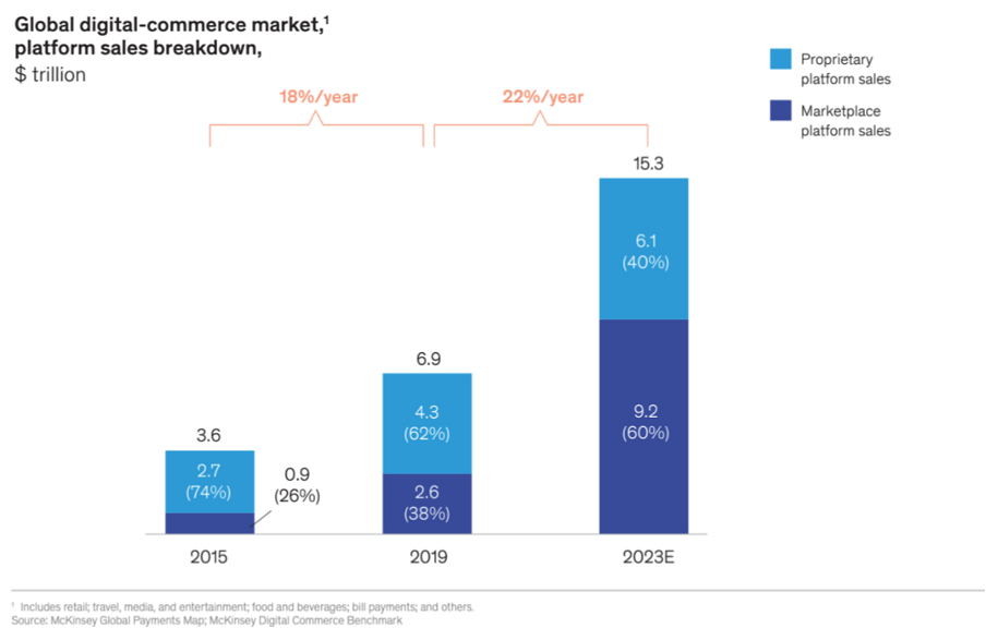 The market opportunity for companies that automate payments for marketplaces, or any fast-growing multi-party platform, is huge. According to McKinsey, digital marketplaces are expected to account for about 60% of digital-commerce volume in the next few years reaching $9Tn. KYC/KYB, pay-in routing, tokenisation, split payments, reconciliation, multi-currency pay-outs - marketplaces usually require all these payments functionalities at once. As we see it, only mega-marketplaces, such as Booking.com, Delivery Hero and Uber, can justify the massive investment in people, regulation and technology required to build the payments infrastructure for effortless instant global commerce.