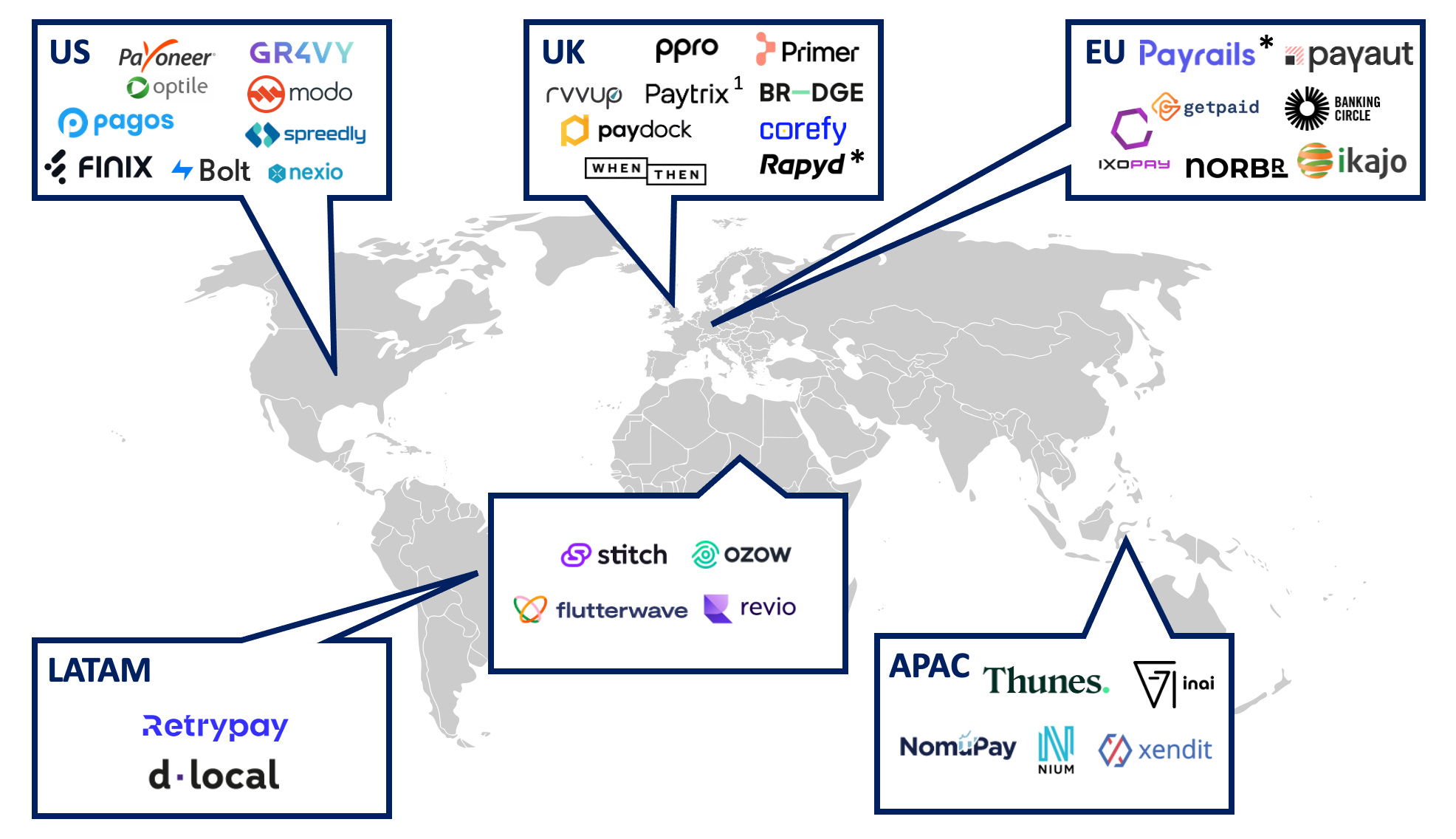 Pay-outs (multi-currency, cross-border, split payments): Multi-currency payments platforms are looking to simplify the process of sending payments out (today initiating bank transfers can involve a number of manual steps such as sending emails, sharing csv files and spreadsheets). They offer a bundled set of bank connections, hosting accounts in multiple currencies with local collections and access to direct payment rails (in other words ‘localised pay-outs’) via one contract and a single API. Some payments platforms strive to do this without being regulated - providing connectivity to third party regulated fintechs like Hyperwallet and Wise instead. Regulated payments platforms offering localised pay-outs are able to insert themselves directly in the flow of funds architecture (meaning they work directly with a bank).